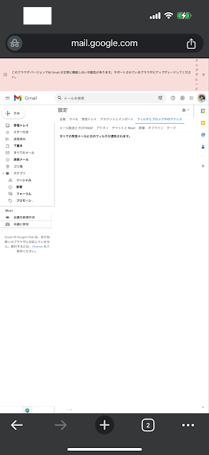 - Gmailの設定から「フィルタとブロック中のアドレス」をタップ